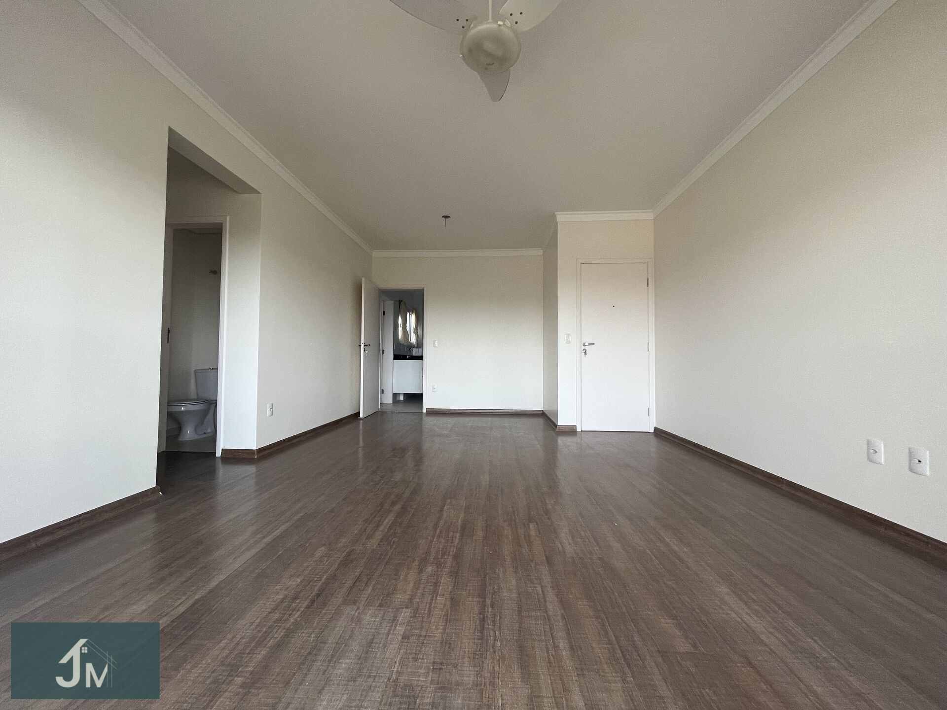Uma aconchegante sala com varanda, sendo sala de tv e sala de jantar com ventilador de teto e piso laminado. 1 lavabo.